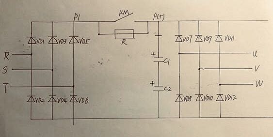 用數(shù)字式萬用表測量二極管,將R、S、T搭接紅表筆,P(+)端搭接黑表筆,測得的是整流二極管VD1、VD3、VD5的正向壓降,為0.5V左右,數(shù)值顯示為540;如將表筆反接,則所測壓降為無窮大。如用指針式萬用表,黑表筆搭接R、S、T端,紅表筆搭接P(+)端,則顯示7KR正向電阻;表筆反接,則顯示數(shù)百KR。因充電電阻的阻值一般很小,如圖3-1所示電路,僅為幾歐,小功率機型為幾十歐,測量中可將其忽略不計。但測其R、P1正向電阻正常,而R、P(+)之間正向電阻無窮大(或直接測量KM常開觸頭之間電阻為無窮大),則為充電電阻已經(jīng)開路了。