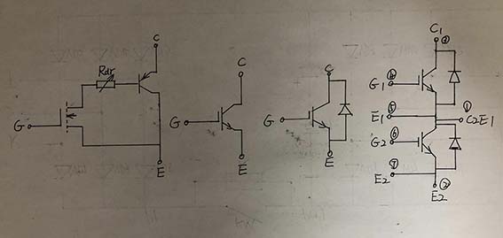 以上說到對端子電阻的測量只是大致判定IGBT的好壞,尚不能最后認定IGBT就是好的,簡易測量后,就對客戶說,輸出模塊是好的,會給自己帶來極大的被動,IGBT的好壞還需進一步測量驗證。如何檢測IGBT的好壞,得首先從IGBT的結(jié)構(gòu)原理入手,找到相應有效的測量方法,如圖所以為IGBT等效電路和單、雙管模塊引腳圖。