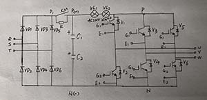 瘵圖中標(biāo)注DSD處斷開,其實電路中為連接銅排,拆去一段連接銅排,即將三相逆變電路的正供電端斷開。注意,斷開點必須在儲能電容之后。假設(shè)在KM1或L1處斷開,儲能電容上存儲的電量,會在逆變電路故障發(fā)生時,釋放足夠的能量將逆變模塊炸毀。如下圖所顯。